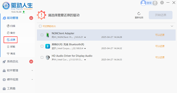 3、如果蓝屏是更新驱动后才出现的,可以选择软件的“还原”界面,选择对应的驱动恢复到之前的稳定版本。