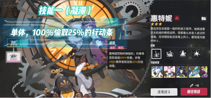 技能四(时光涌流):友方单位释放伤害类技能后,其余钟表怪有20%概率追击主目标,惠特妮为40%。