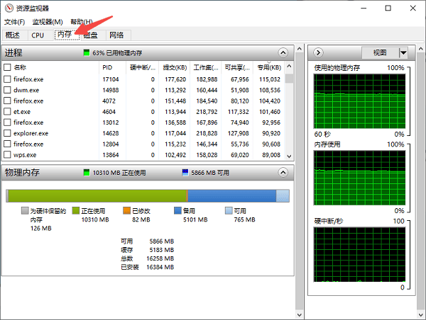Windows 自带的资源监视器工具也能查看内存使用分布、缓存、可用内存等更细致的实时状态。