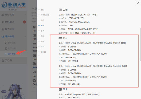 如果你希望查看更加详细的内存信息,比如品牌、频率、通道数量、插槽分布情况等,推荐使用驱动人生这款工具。它不仅可以用于更新驱动,还内置了硬件信息检测功能,让你快速了解整个电脑配置。