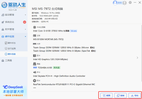 4、如果有需要,你还可以通过“截图”或“复制”功能将这些硬件配置信息保存到电脑,方便你随时使用。