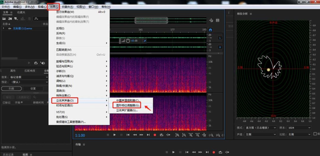 4、点击顶部工具栏中的“效果”——“立体声声像”——“图形相位调整器”。