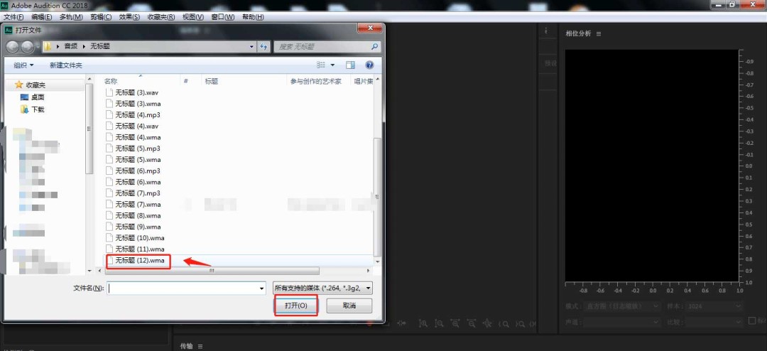 2、在弹出的导入文件窗口中,选择需要的音频素材,点击打开。