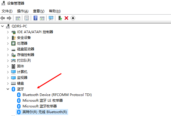 2、在设备管理器中查看是否有如下图的 蓝牙图标。如果有,说明你的电脑已支持蓝牙。