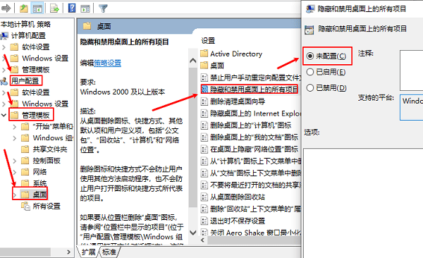 1、按Win R,输入gpedit.msc并按回车。2、在左侧依次展开:用户配置->管理模板->桌面3、在右侧找到“隐藏和禁用所有桌面项”,双击打开。4、选择“未配置”或“已禁用”,然后点击“应用”并“确定”。
