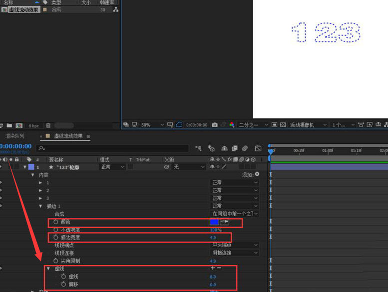 6.最后,勾选虚线,并适当调整颜色、宽度,最后为虚线设置偏移量关键帧即可