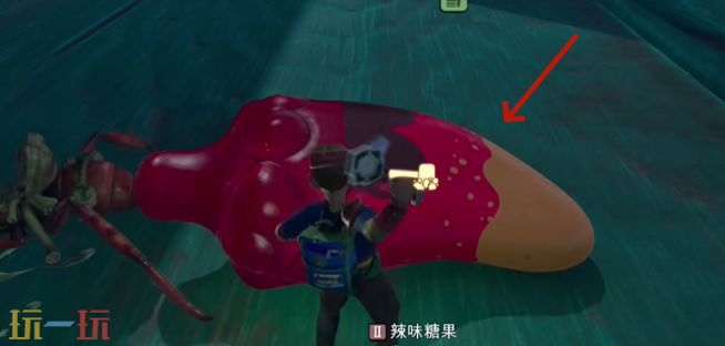 3、再左转一眼就能看到辣椒形状的糖果,用二级锤或铲子敲碎直接拾取辣味糖果。
