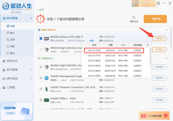 3、在扫描结果中找到显卡驱动,点击“升级驱动”按钮,驱动人生将自动下载并安装最新的显卡驱动。