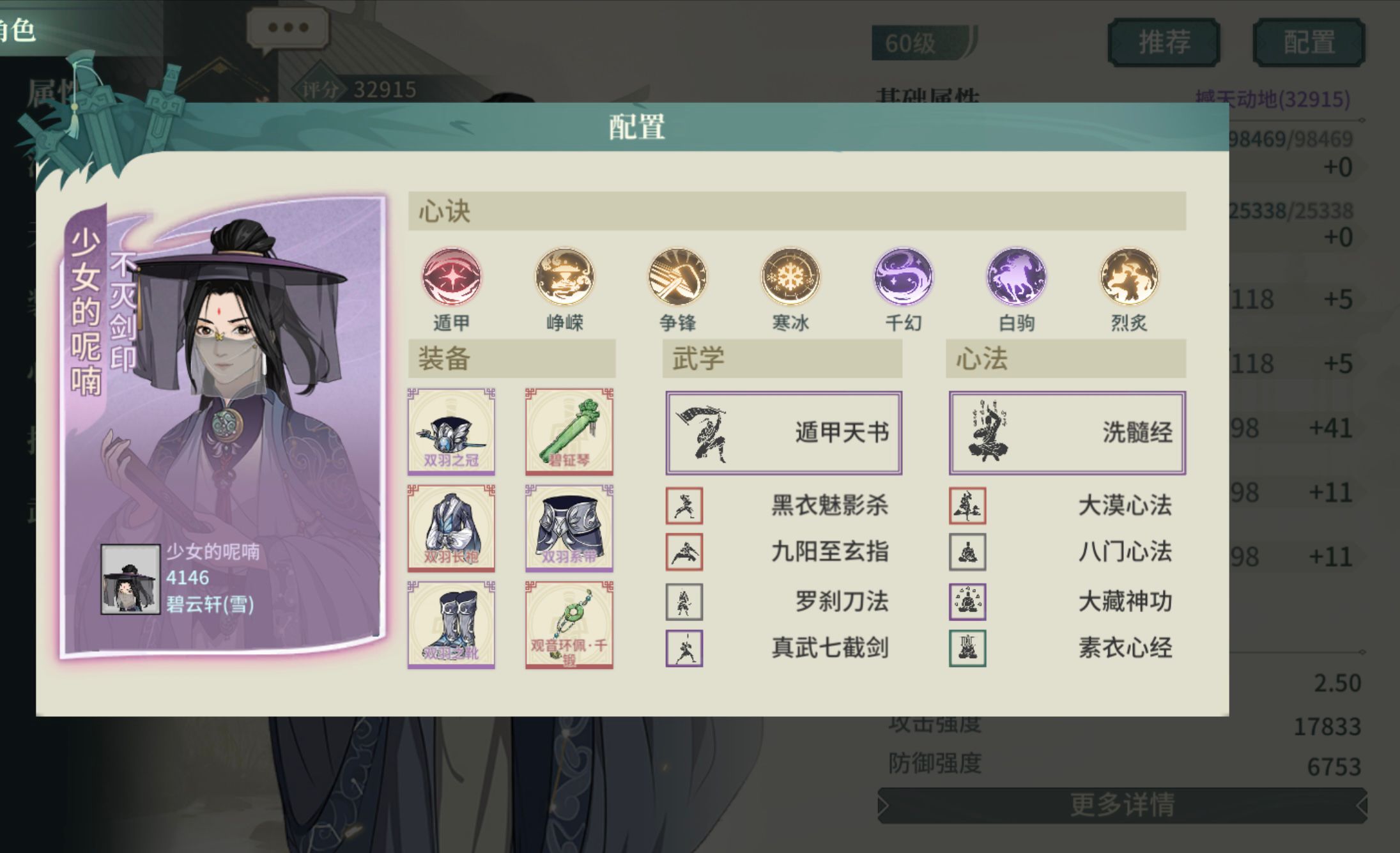 上图为我目前使用配置。在上一版本便选择了新武器碧琴,罗刹剑丢失的眩晕由罗刹刀补足。碧琴配合分身为团队和自身提供一定生存能力,为此选择了素衣代替黄鸡剑提供怒气的同时拉高盾量,搭配不灭天赋和回盾加成武道,补足遁甲的生存能力(虽然依旧经常暴毙)。素衣对应挤掉了回蓝的心法位置,这里选择峥嵘提供回蓝,同时补足了一些回怒,既避免了遁甲开局缺怒的尴尬情况,也增加了不灭免移除天赋的触发。控制心诀上寒冰必不可少,烈炙和蝎毒同样重要可自行替换。上一版本选择带蝎毒主冰指,主打速推,不灭潜质下负穿的补足、天赋加盾的持续性使得遁甲再次拥有一定中长时序作战的能力,换回烈炙配合观音拉高长线收益。另外注意,观音佩可洗练双负面或三负面,以适配不灭天赋和剑阵封心武道。