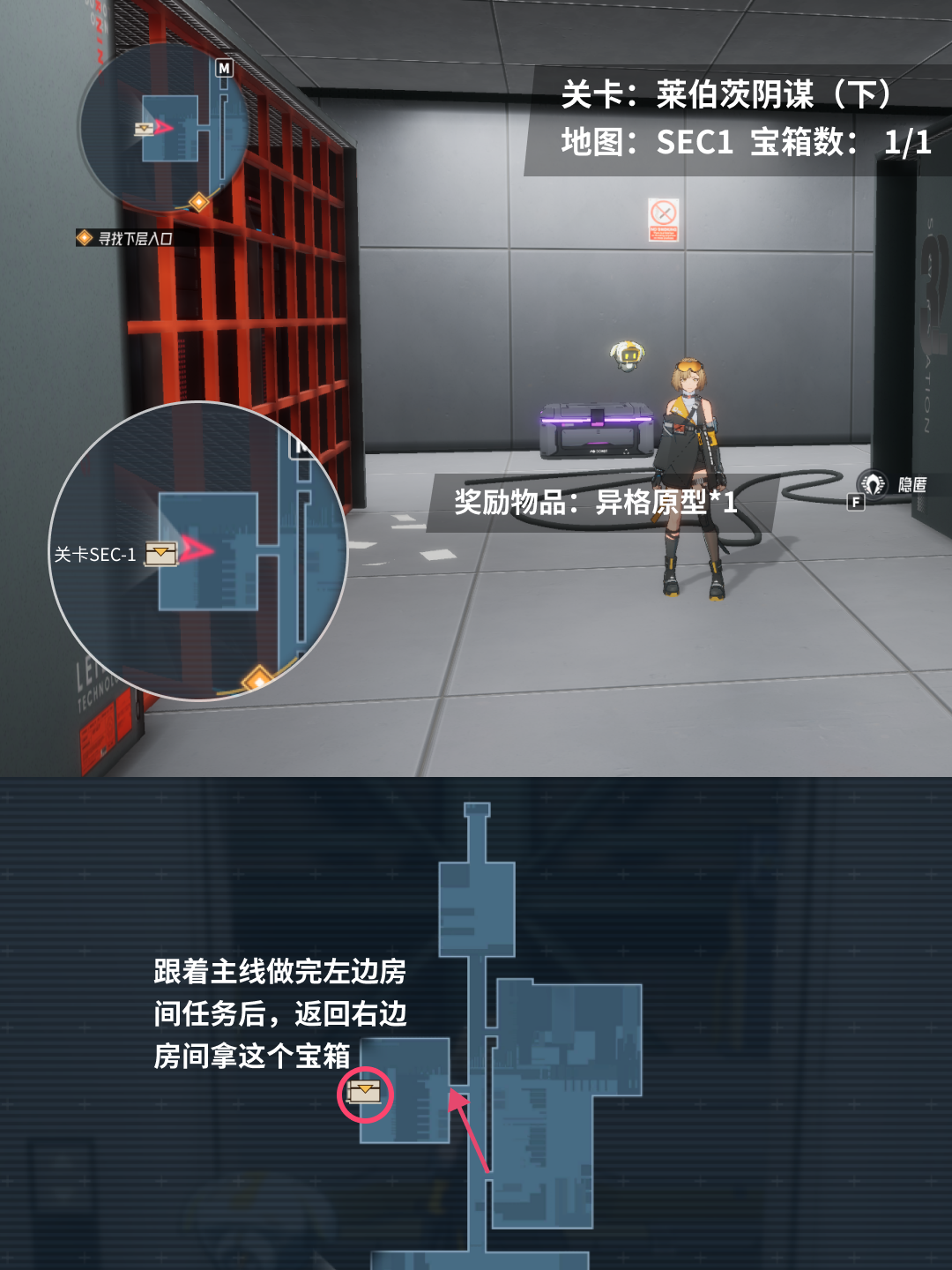 在本章地图里,第一个可拿到的宝箱,需要在主线任务第一阶段的剧情完成后,返回到另一侧的房间去收集。剩下的4个宝箱,在跟进剧情时都会直接遇到,收集起来并没有特别的难度啦。具体的宝箱位置和奖励情况可以在组图里查看~