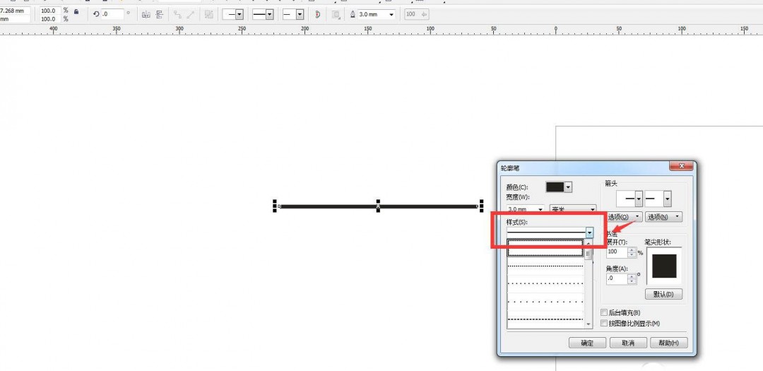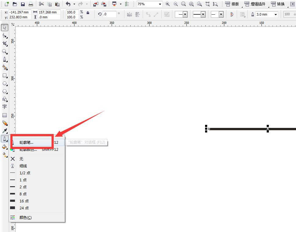 3、轮廓笔工具。点击工具栏中的轮廓笔工具,打开面板设置参数。