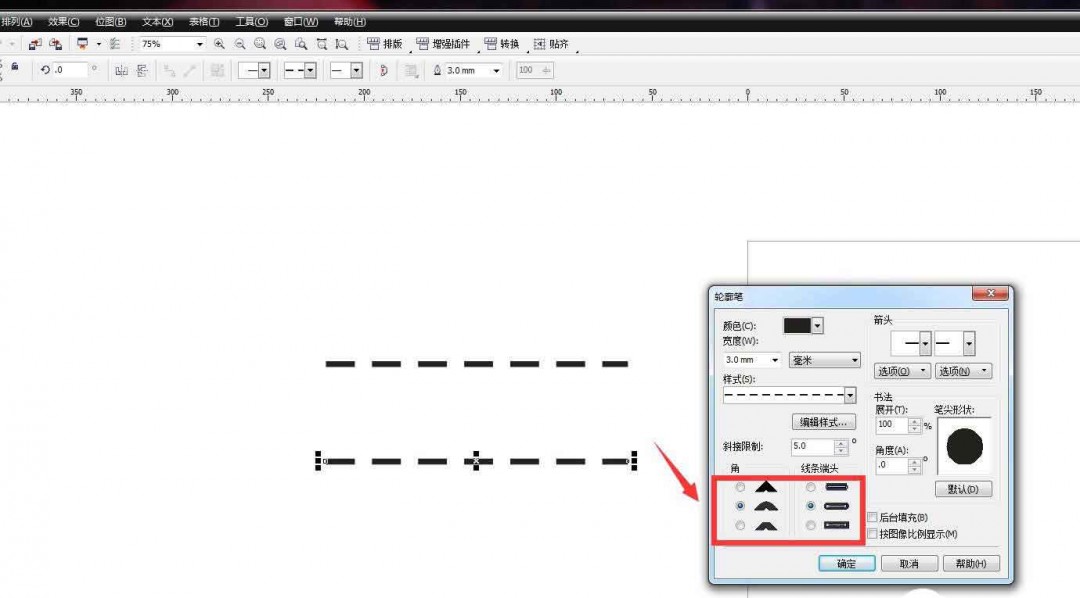 6、设置圆角端头。再次打开轮廓笔工具,在端头这里设置为圆头,角设置为圆角点击查看。