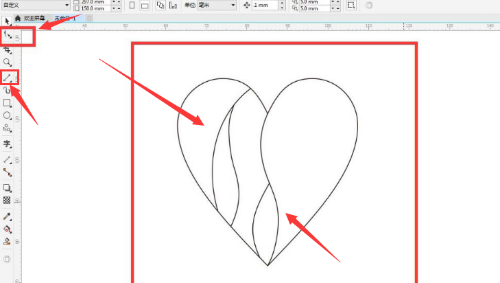 2.然后,点击两点线工具为心形绘制线条,并用形状工具将直线调整成弧线效果