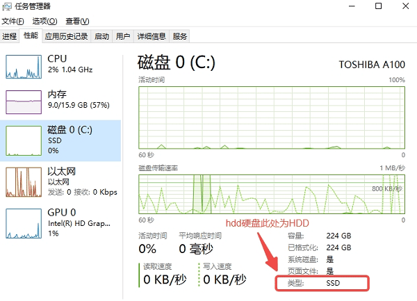 系统会显示磁盘类型,如果看到HDD字样,就说明你的硬盘是HDD。