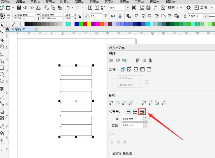 4.最后,如下图所示输入参数值,点击垂直分散排列按钮即可