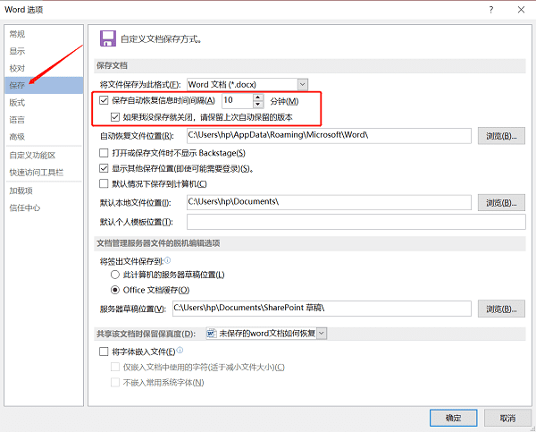 2、检查“自动保存时间间隔”和“将上次保存的版本保留为备份”是否已启用。