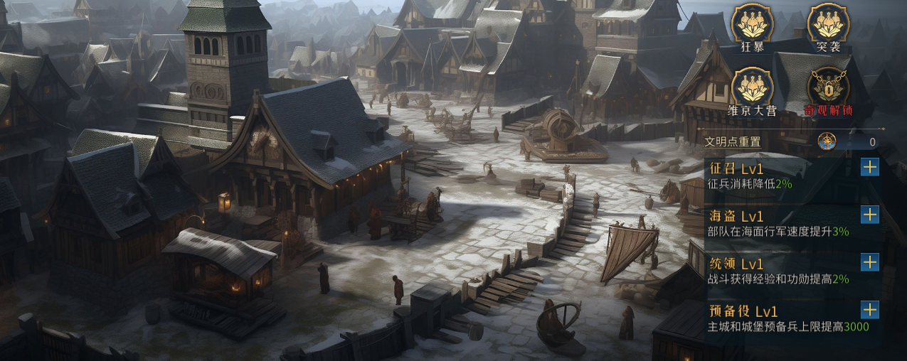 如果此时资源充足,这时候我们就要考虑建造我们的特色建筑“维京大营”了,只需要我们消耗一些铜币,就可以让我们获得更多的兵力,而且我们在建造完这个建筑后,就可以使用“鼓舞”技能了,维京文明没有过多繁琐的操作,对我们新人的整体理解来说,都非常的好理解。在有了大约5支部队后,我们就需要考虑攻城略地了。毕竟作为前期文明,维京人在后期很难发挥作用。一般来说,我们都选择攻打周边的AI中立城池,或者前期比较弱的文明,去占领关键地盘,当然,作为新手的我们只需要老老实实的欺负下AI就可以了。