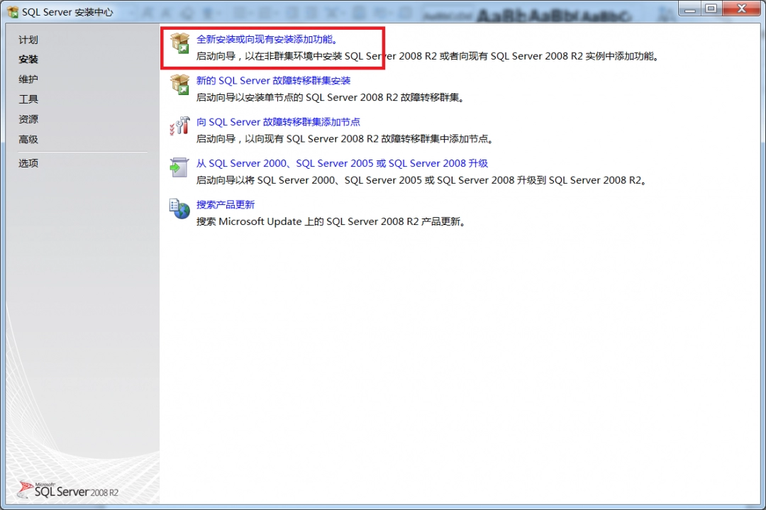 3.选择右侧的“全新安装或向现有安装添加功能”,如下图所示。