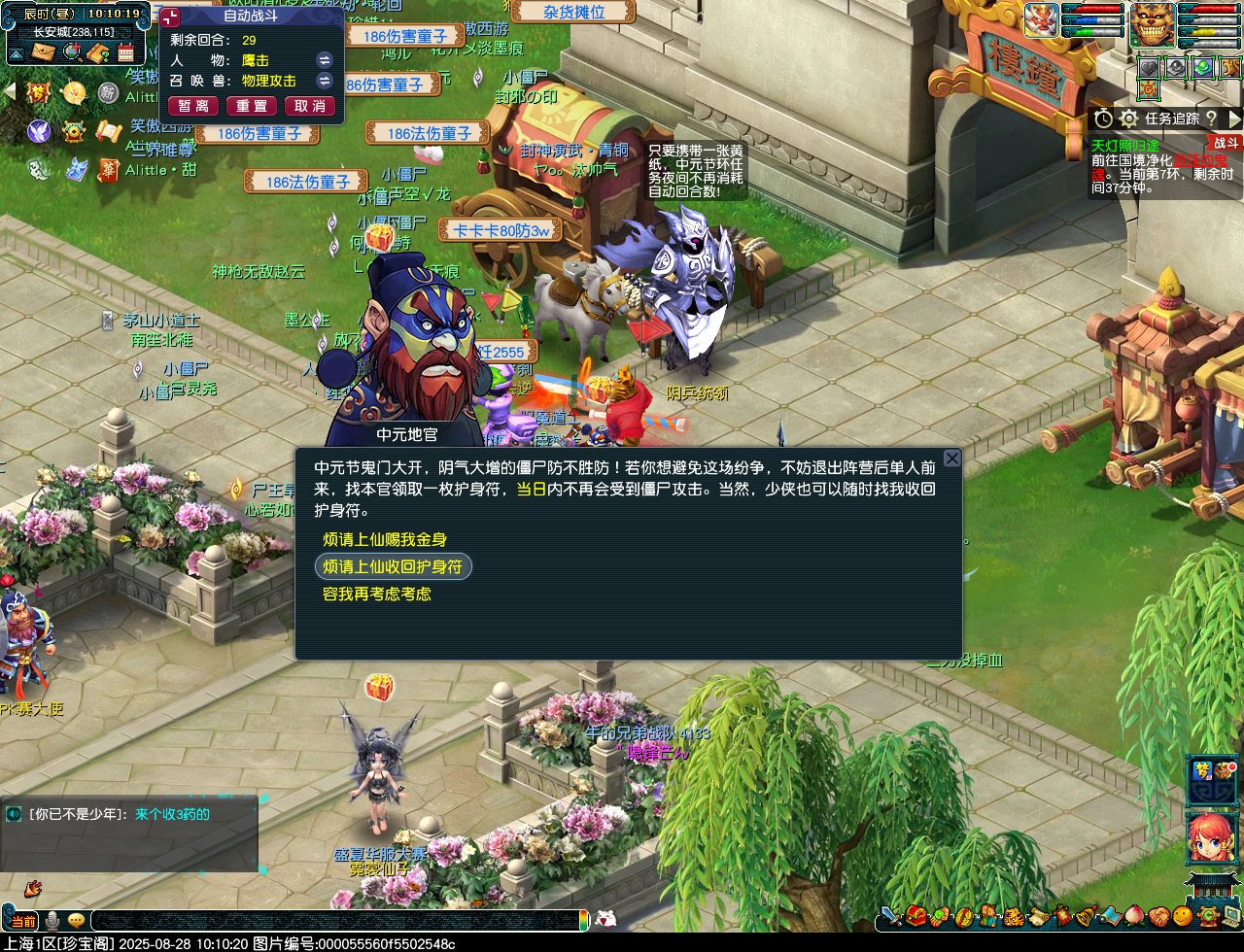 中元节僵尸大作战玩法向来是让玩家们又爱又恨的项目,爱的人在人群中穿梭不断,完全停不下来,恨的人莫名地被人变来变去也会比较懊恼。但这个情况在今年的玩法中有所优化。首先今年被人变身以后不会强制改变造型了,在该玩法中既可以选择展示阵营形象,也可以选择得到一具当前阵营形象(道士/僵尸)的傀儡跟随玩家,不再影响玩家本身美美帅帅的造型。其次玩家可以选择在中元地官处领取护身符,便可在当日不被该玩法影响。
