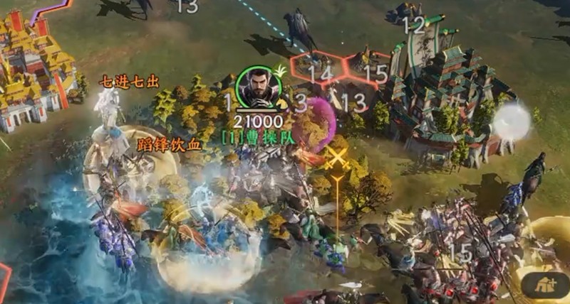 曹操的技能组合以增益为主,三个主动和被动技能相互配合,形成完整的辅助体系。其中,“成霸安疆”是核心战术技能,先对敌方造成伤害,再提升我方武力最高者25%的技能伤害,持续两回合。这一技能适合在主力输出行动前使用,以最大化增伤效果,尤其适合与吕布等高爆发武将搭配。