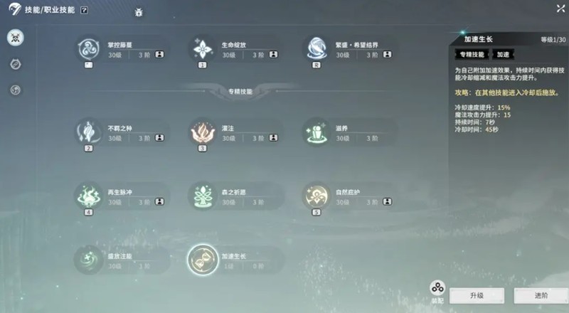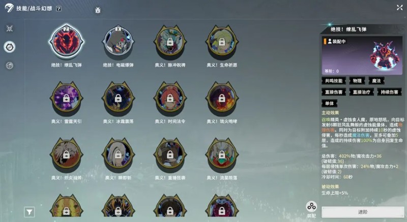 技能体系分为本职业技能、战斗幻想技能和共鸣技能三部分。其中,本职业技能和战斗幻想技能对战力提升有直接作用,而共鸣技能更多用于辅助跑图。本职业技能可以通过升级和进阶来强化,升级主要提升固定数值,进阶则提高倍率或效果量。玩家可选择四个专精技能搭配,通过合理配置提升技能模块的战力分数。