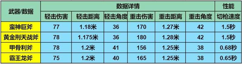 在与黄金刑天战斧、甲骨利斧、霸王龙斧对比中我们发现,蛮神巨斧在各项数据表现中都十分出色,重击伤害和角度更是非常优秀,仅仅是切枪速度上有些差距,不过这都可以忽略不计。