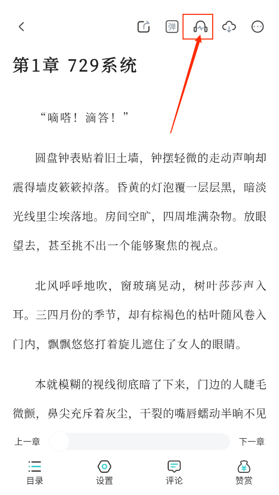 3、进入阅读页面点击中间区域呼出菜单,然后点击"听书"图标,如图。
