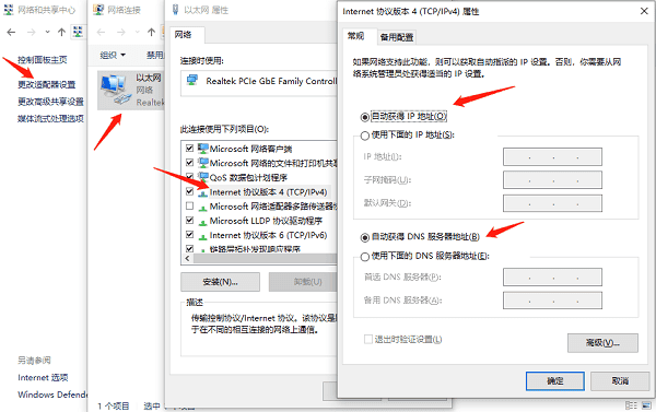 2、进入“控制面板”中的“网络和共享中心”,点击“更改适配器设置”,右键点击您正在使用的网络连接,选择“属性”。查看无线网络适配器的配置,确保其设置为“自动获取IP地址”。