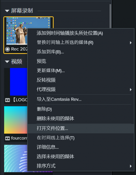 3.如果在Camtasia的素材库中预先导入了自己的素材,却忘记了素材在电脑中保存的位置,可以右击打开菜单,选择“打开文件位置”。