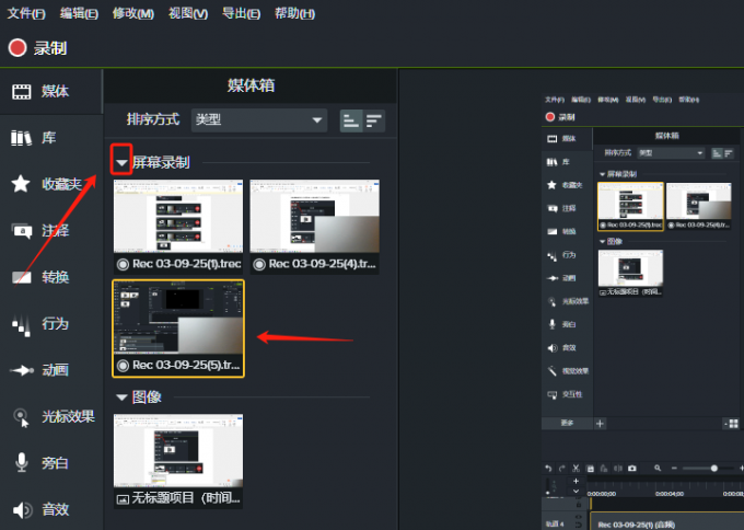 2、点击媒体箱中的“屏幕录制”选项后,我们就可以发现刚刚录制好的文件。刚录好的文件外圈自带黄色边框,所以查找文件一目了然。