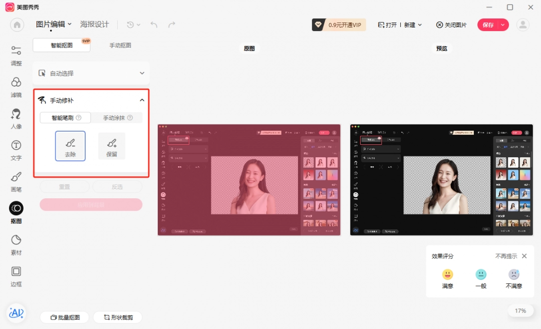 6.微调抠图效果: 涂抹完成后,进入下一步,软件将自动显示抠图结果。如有需要,使用“修补”工具进行微调,包括“橡皮擦”和“画笔”来修正抠图区域。