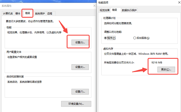 2、在“性能”选项卡中选择“设置” -> “高级” -> “更改”。