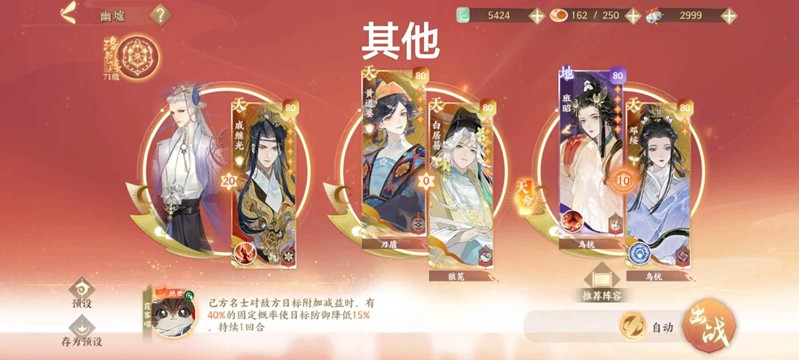戚继光/徐霞客穿李白的重蕴文曲套。自动,先打李师师,再打韩非/于谦,保证于谦第九回合前锁血。本周试了下把戚继光换成徐霞客,感觉容错率更高,主要是可以给全体上毒,压全体的血量,只靠班昭普攻2人/大招3人太随机,很容易韩非或者于谦其中一个血量压不下来。