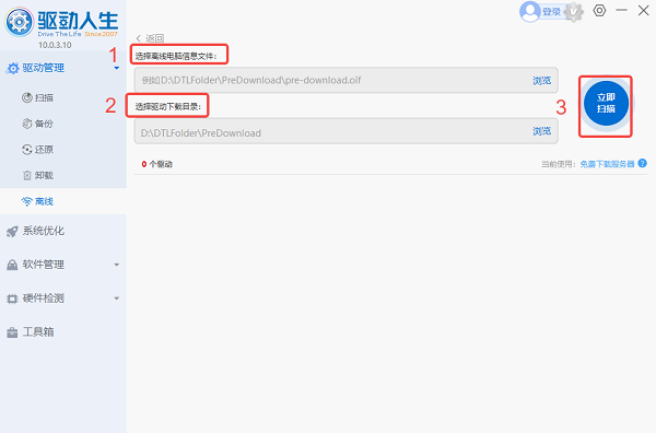 3、将U盘插入联网的电脑,同样打开驱动人生,进入“离线”界面,点击“下载”,选择设备信息文件。指定下载位置后,点击“立即扫描”,然后下载匹配的网卡驱动程序。