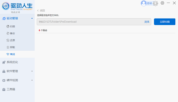 4、将U盘插回离线电脑,打开驱动人生,选择“离线”模式中的“安装”,找到U盘中已下载的驱动文件夹,点击“立即扫描”,最后“一键安装”或“升级”网卡驱动程序即可。