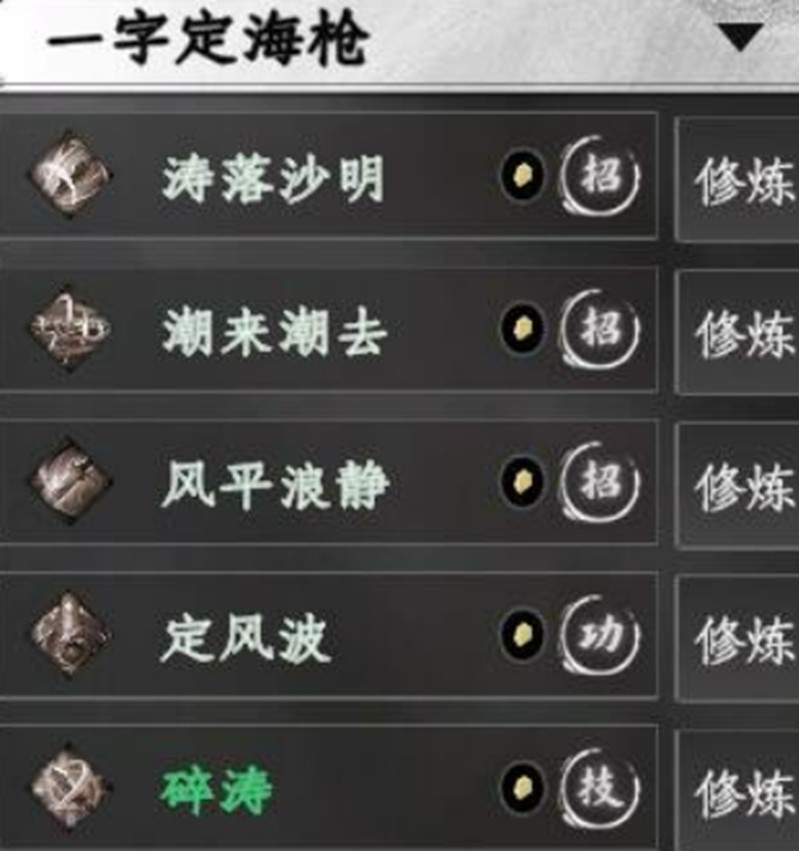 一字定海枪则以其稳定的控制和持续伤害见长,涛落沙明在蓄力后能够对单个目标造成击退和流血效果,最高可叠加三层的流血状态让敌人难以招架。潮来潮去技能则能横扫周围敌人并附加眩晕效果,同时为使用者提供生命恢复,配合被动技能沙场,使玩家在群战中能够保持持久的战斗力。