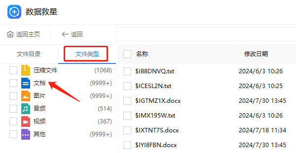 步骤2:从软件中扫描出的数据会逐一显示在扫描结果中,你可以根据“文档类型”来快速定位查找,这里选择“文档”。