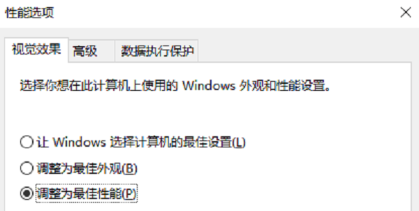 在搜索框输入“调整外观和性能”,然后选择对应的结果进入系统属性界面。选择“调整为最佳性能”以减少图形界面开销。