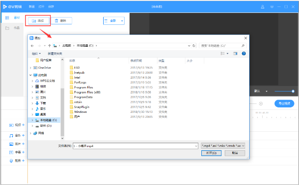 2、登录ev剪辑软件之后,点击页面左上角的“添加”选择需要进行剪辑的素材即可(包括音乐、图片、视频等)。可以看到所有添加的素材都会出现在素材区。