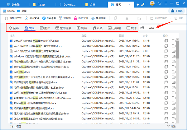 在软件界面的搜索框中输入关键词、文件名的一部分或是特定的文件类型(例如*.docx)。