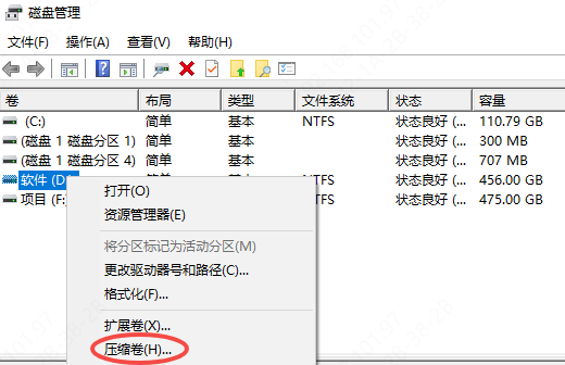 3、如果C盘旁边的分区有足够的未使用空间,右键点击该分区,选择“压缩卷”。