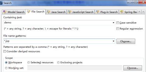 然后我们找到第二个File Search在这里可以选择你要全局查找的文件的类型,输入要查找到的内容即可,如图为例就是查找在所有的jsp中有“联系电话”这个词语的。
