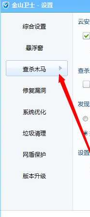 进入到设置界面之后在左侧的功能列表中选择“查杀木马”这一项。