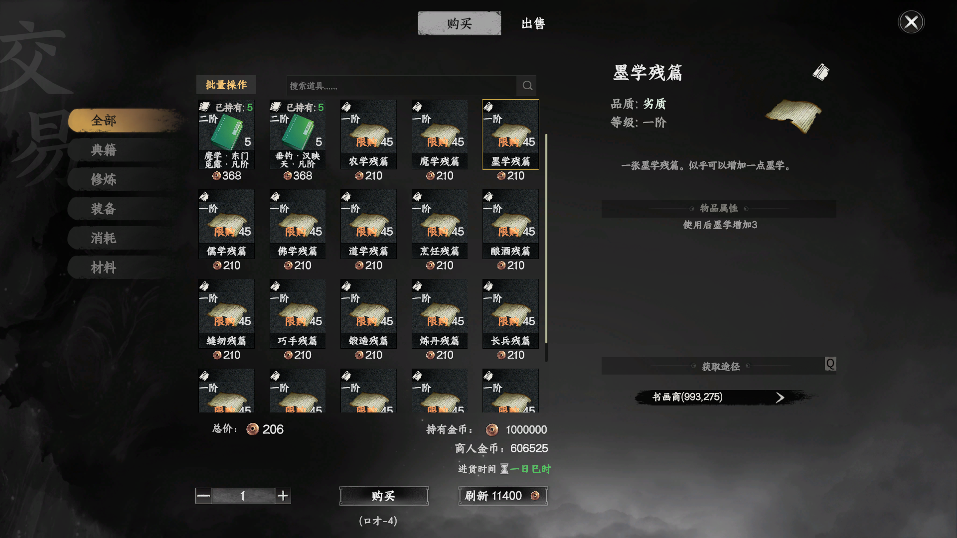 除了暗器的属性书都可以在三个书画商购买每个战术,学识,生活,技艺的135本属性书,一本加三点,就是405点属性点