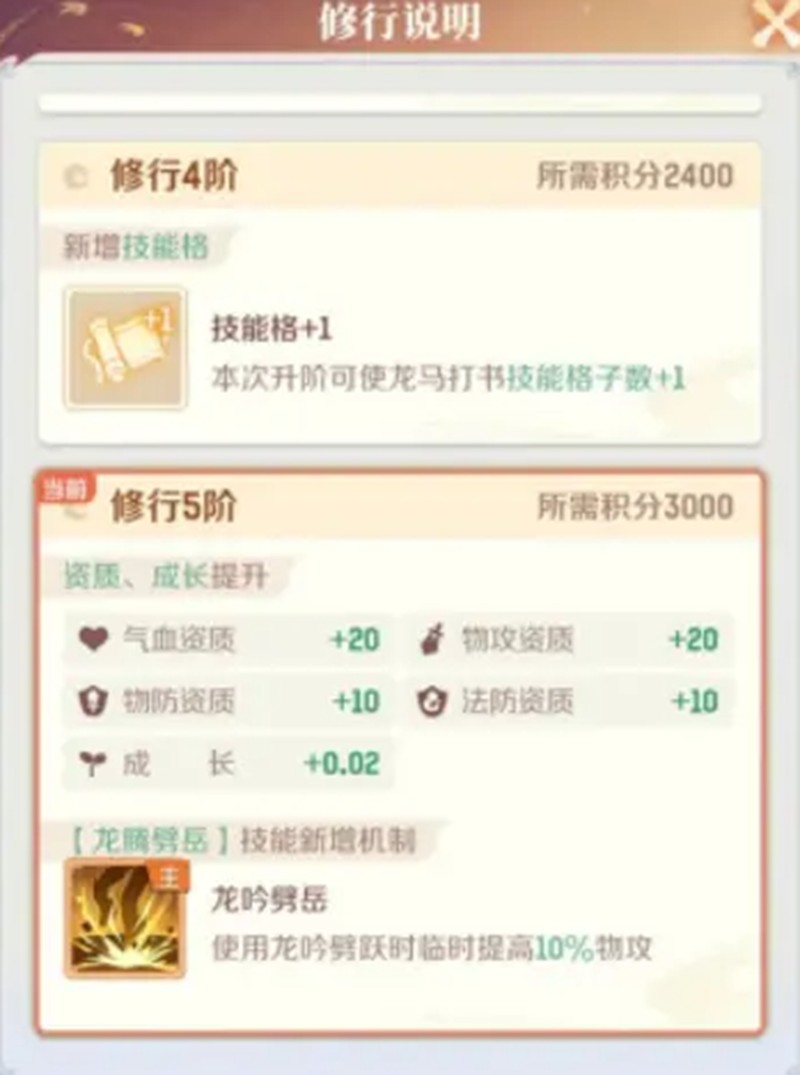 高级神工能够放大核心技能的伤害。这项技能可以有效提升龙吟劈岳的基础倍率,与团队增伤效果形成叠加。高级爆伤专门强化暴击时的输出效率,配合装备特效可以达到很高的伤害峰值。