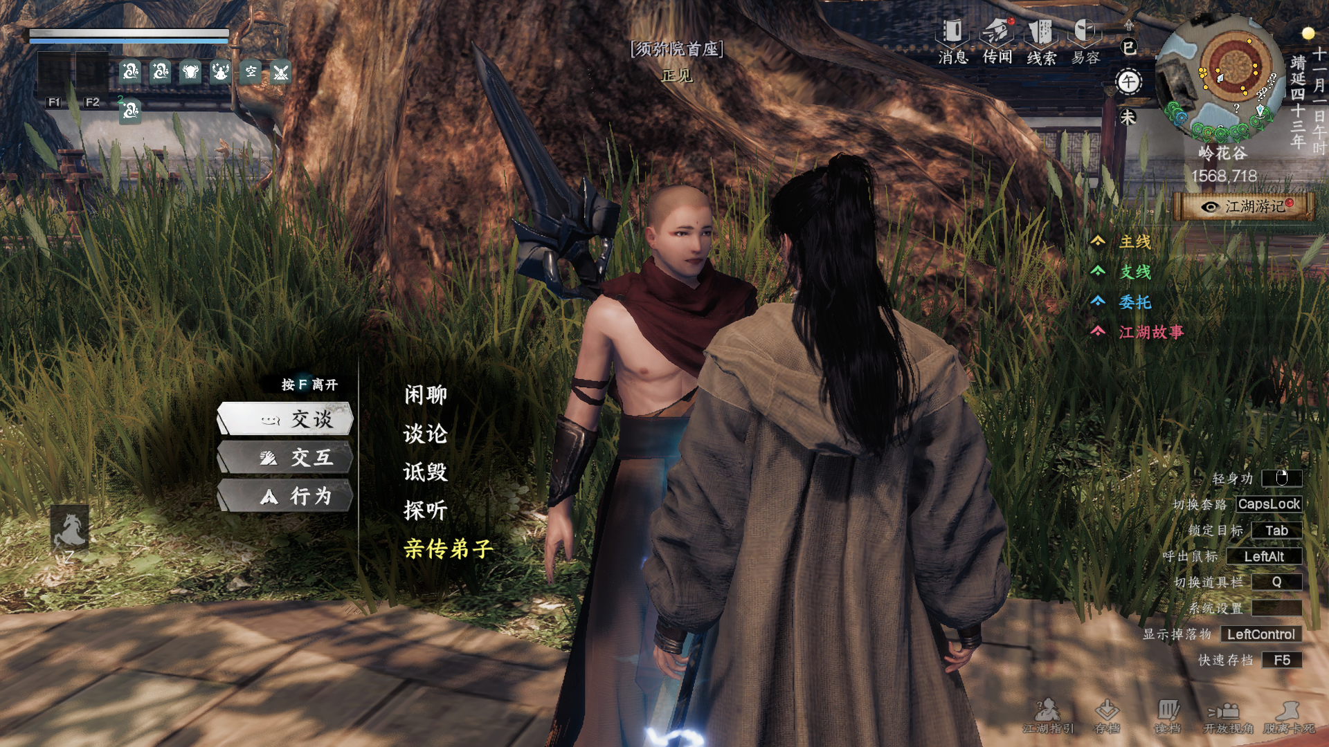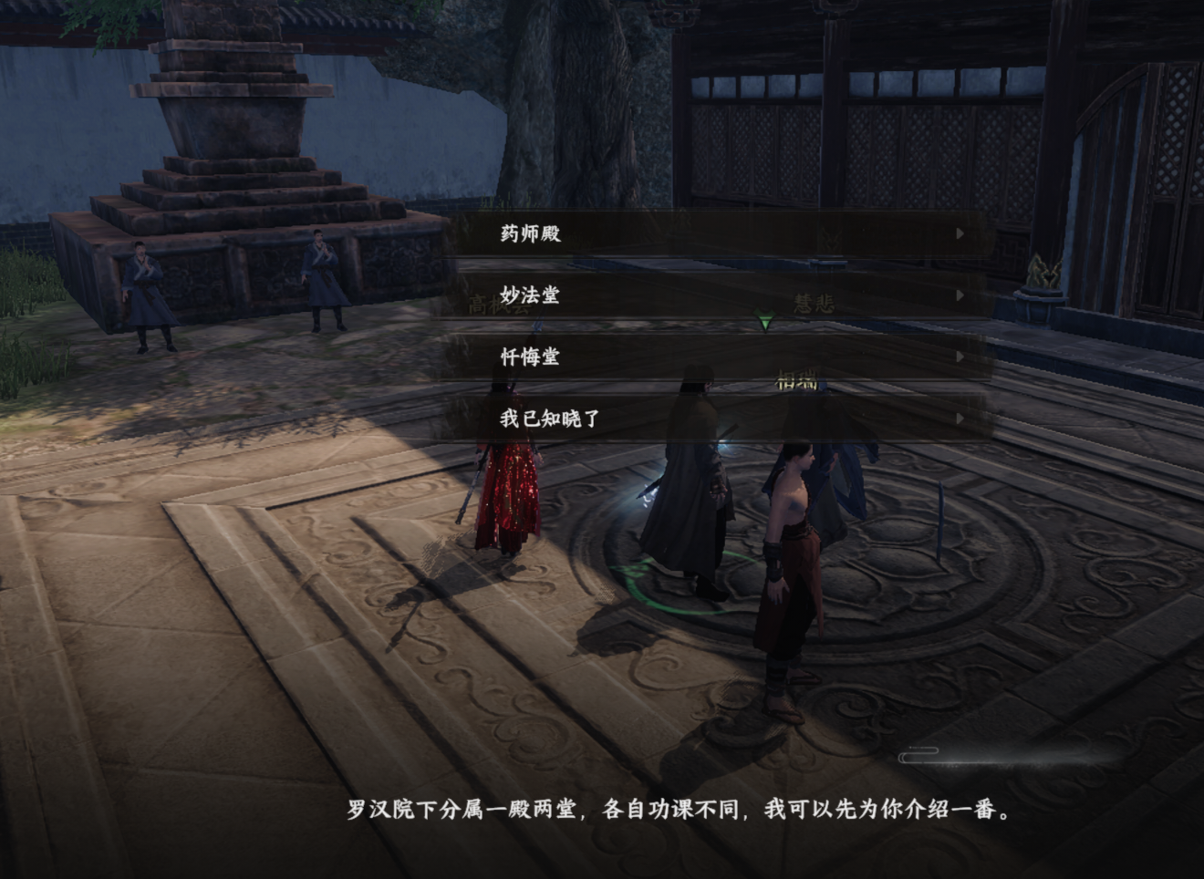 三个选项拜师任意选一个,然后会自动来到师傅旁边,交谈师傅修行后来到嵩室山守门弟子参加诵经大会