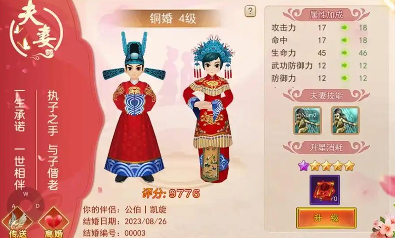 婚后可解锁两项核心技能:铜钱传送和复活伴侣,技能等级受姻缘等级影响,最高可达10级。姻缘等级提升后,可解锁技能等级上限。同时,夫妻还可获得攻击、防御、生命三项属性加成,后期每级提升攻击+5、防御+3、生命+20,满级共提升50攻击、30防御、200生命。日常玩法中,夫妻需组队在同一场景接取姻缘任务(如共同打怪、采集同心草),完成后增加姻缘xp,自动提升姻缘等级。