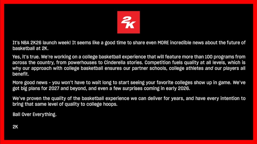 声明还透露,玩家将在今年的游戏中开始见到一些《大学篮球》的身影,但大部分内容会从2027年开始逐步落地,并在此后扩展。“你们不用等太久,就能看到心爱的大学球队登场。我们在2027年和之后几年有着宏大的计划,甚至在2026年初还准备了一些惊喜。”