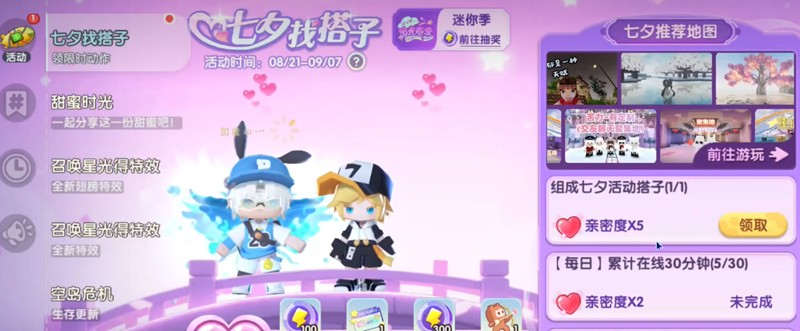 时间:2025-09-06 | 作者: | 阅读:0迷你世界七夕活动将于8月21日正式开启,其中最引人注目的是"七夕找搭子"互动玩法。玩家通过登录游戏、保持在线状态以及与好友一起探索迷你世界,都可以提升亲密度值。当亲密度达到一定数值后,就可以兑换专属称号"xx的小宝贝"和特别的"发射爱心"动作表情。