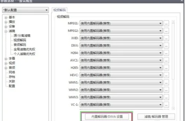 在设置界面中,找到并点击“内置解码器/DXVA设置”选项。